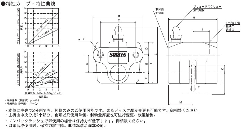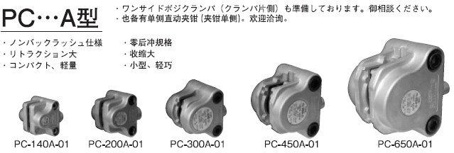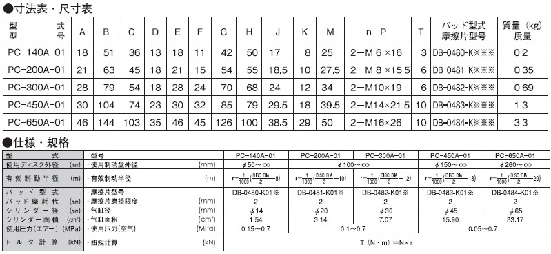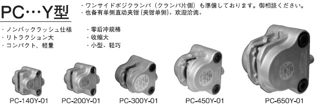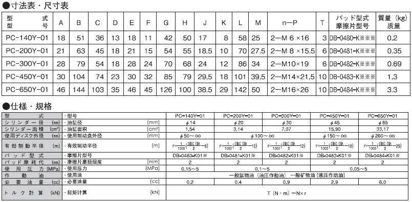 Hydraulic and pneumatic spring release type. Special disc brake designed for emergency stopping. This product has zero backlash and is used to control the main shaft of machines, clamping jigs and for positioning trolleys or conveyers. PC-140A-01, PC-200A-01, PC-300A-01, PC-450A-01, PC-650A-01; PC-140Y-01, PC-200Y-01, PC-300Y-01, PC-450Y-01, PC-650Y-01.