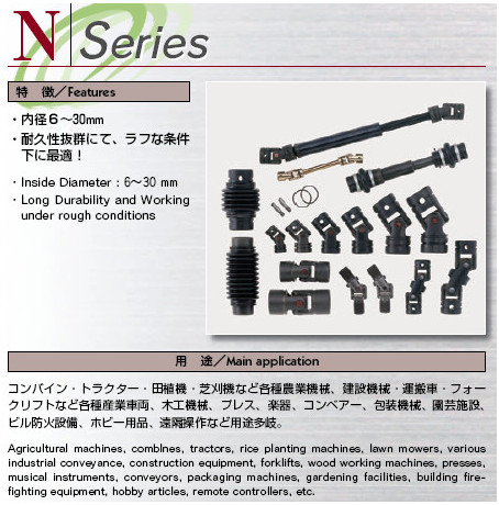 ซีรีส์ N มีเส้นผ่าศูนย์กลาง 6-30mm มีความทนทาน สามารถทำงานได้ในทุกสภาวะ ผลิตภัณฑ์ใช้กับเครื่องจักรกสิกรรม เคลื่อนย้ายรถยนต์ เครื่องจักรงานไม้ เครื่องดดนตรี อุปกรณ์ทำความสะอาดสวนและอุตสาหกรรมอื่นๆ ผลิตภัณฑ์ที่ซีรีส์NC,ND,NP