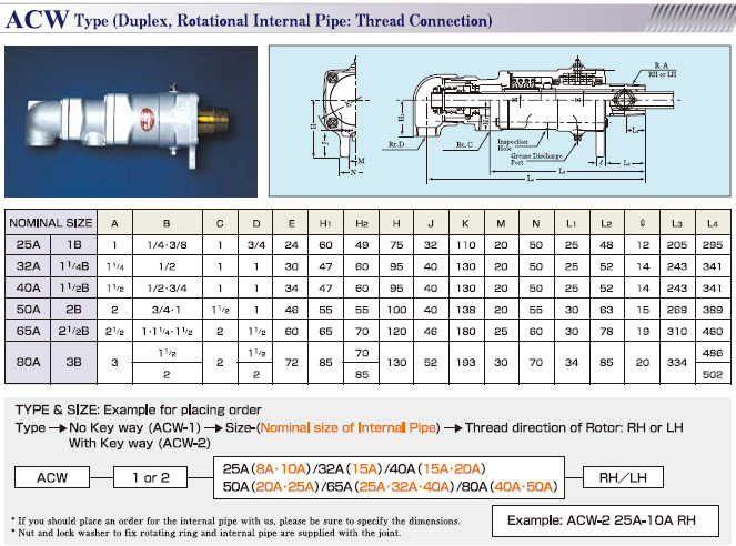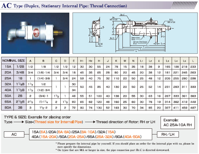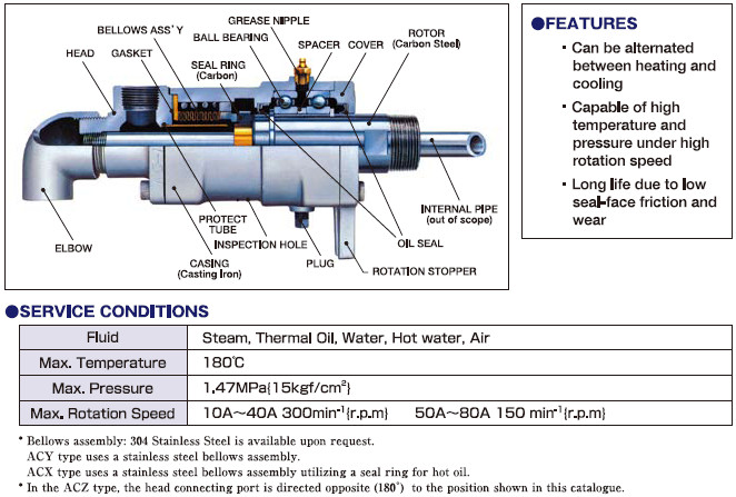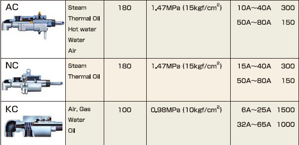 ซีรีส์AC (Steam Thermal Oil Hot water Water) สามารถหมุนด้วยความเร็วสูงภายใต้อุณหภูมิสูงและมีแรงดันสูง สามารถใช้งานเพิ่มความร้อนและสลับกับการให้ความเย็นได้ เกิดการสึกหลอน้อย มีการใช้งานได้ในระยะยาว ใช้งานกับตัวสื่อกลางเป็นไอน้ำ,ให้ความร้อนกับของเหลว,น้ำ,น้ำมันและอากาศ อุณหภูมิสุงสุดที่ 180 °C แรงดันสูงสุดที่1.47MPa,40A ความเร็วในการหมุนสูงสุดที่300รอบ/นาที ระหว่างที่50-80Aเป็น100รอบ/นาที