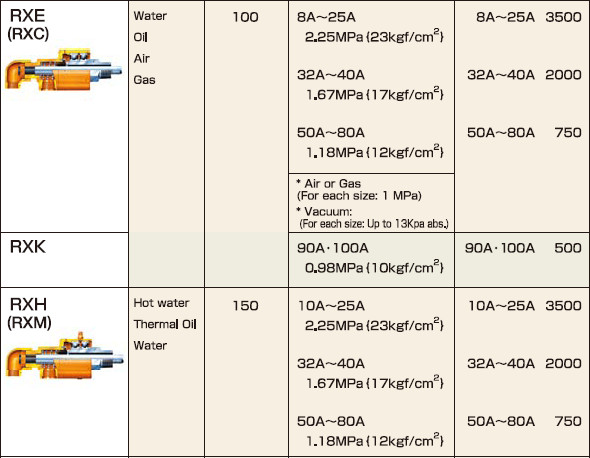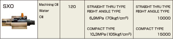 ซีรี่ส์SXO มีน้ำหนักเบา ขนาดเล็ก ควบคุมเครื่องจักรง่าย มีความแม่นยำสูง เหมาะใช้เป็นตัวสื่อกลางในการแยกน้ำมัน น้ำและน้ำมัน อุณหภูมิสูงสุดที่120 °C แรงดันสูงสุดที่6.9 MPa (Straight Thru Type, Right Angle Type) 10,000รอบ/นาที SXO-200 Compact Type แรงดันสูงสุดที่10.3 MPa 150,000รอบ/นาที