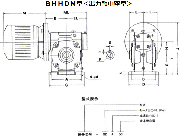 | 型 番 | 減 | モータ | 取付ベース | 出力軸 | G | H | I | J | L | M | ML | E | EL | φd | t | 質 | オイル | |||||